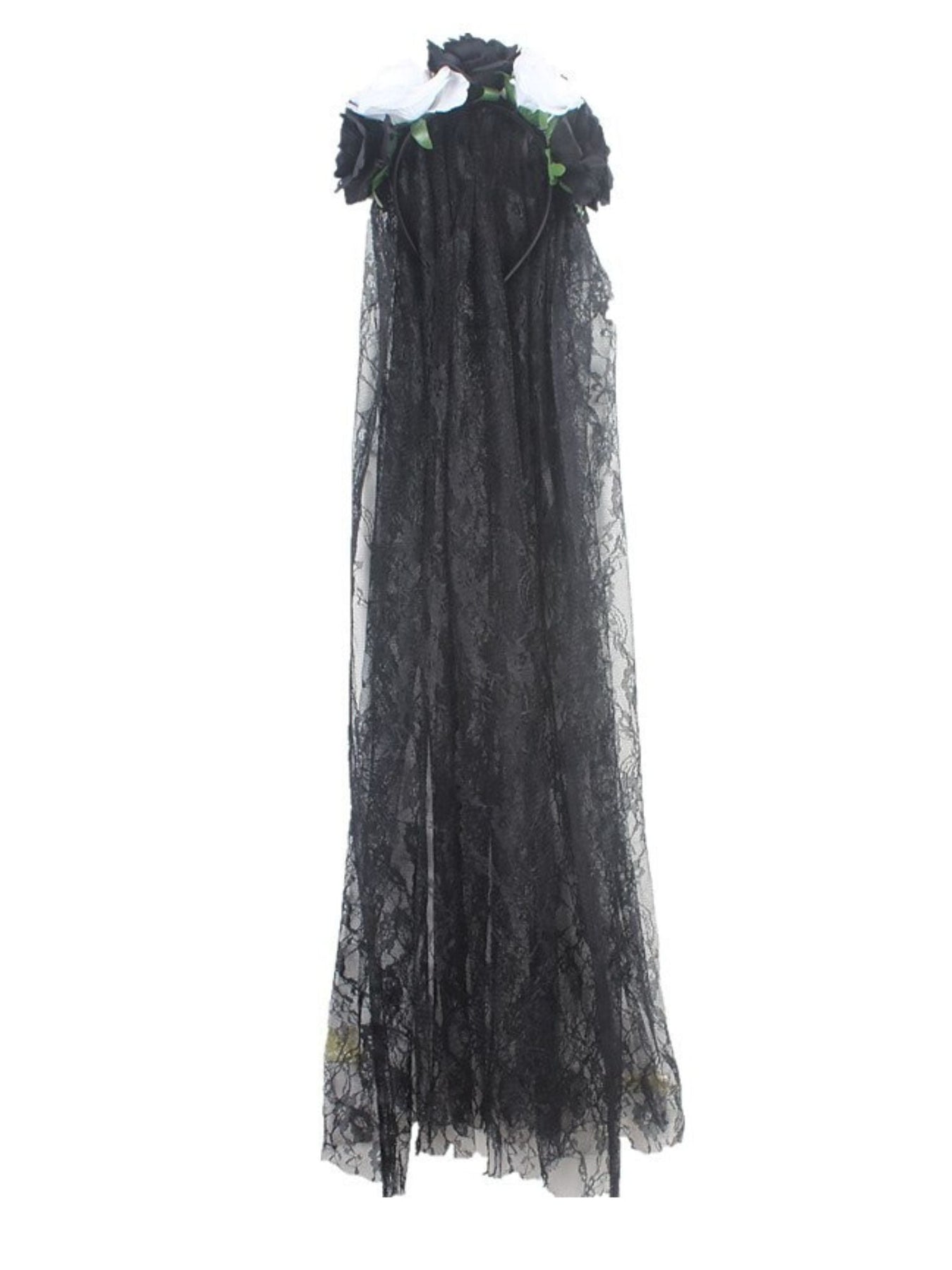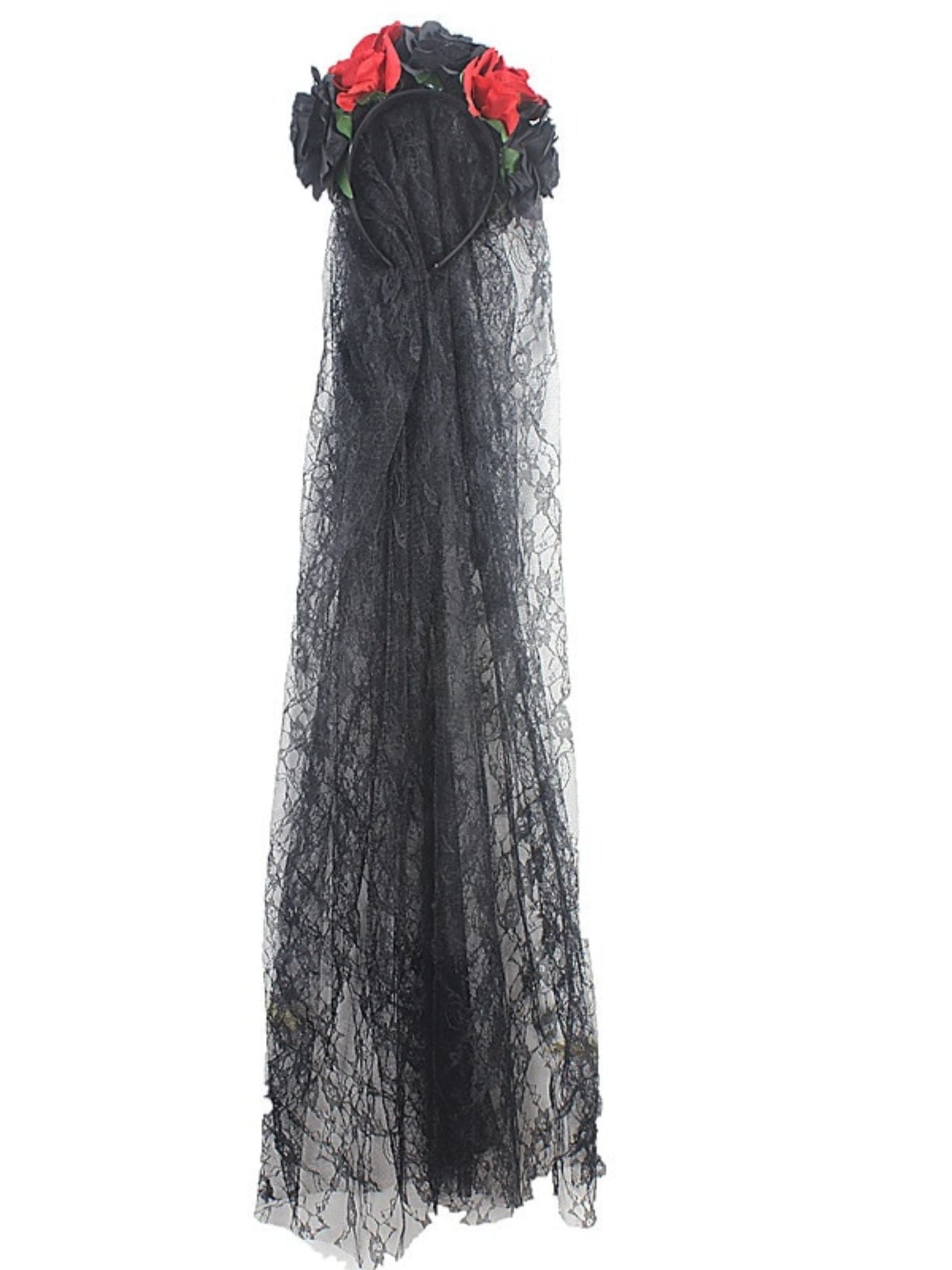 MON6041075W Coiffe Transparente à Fleurs Noires et Rouges pour Halloween, Accessoire de Mascarade pour Cosplay