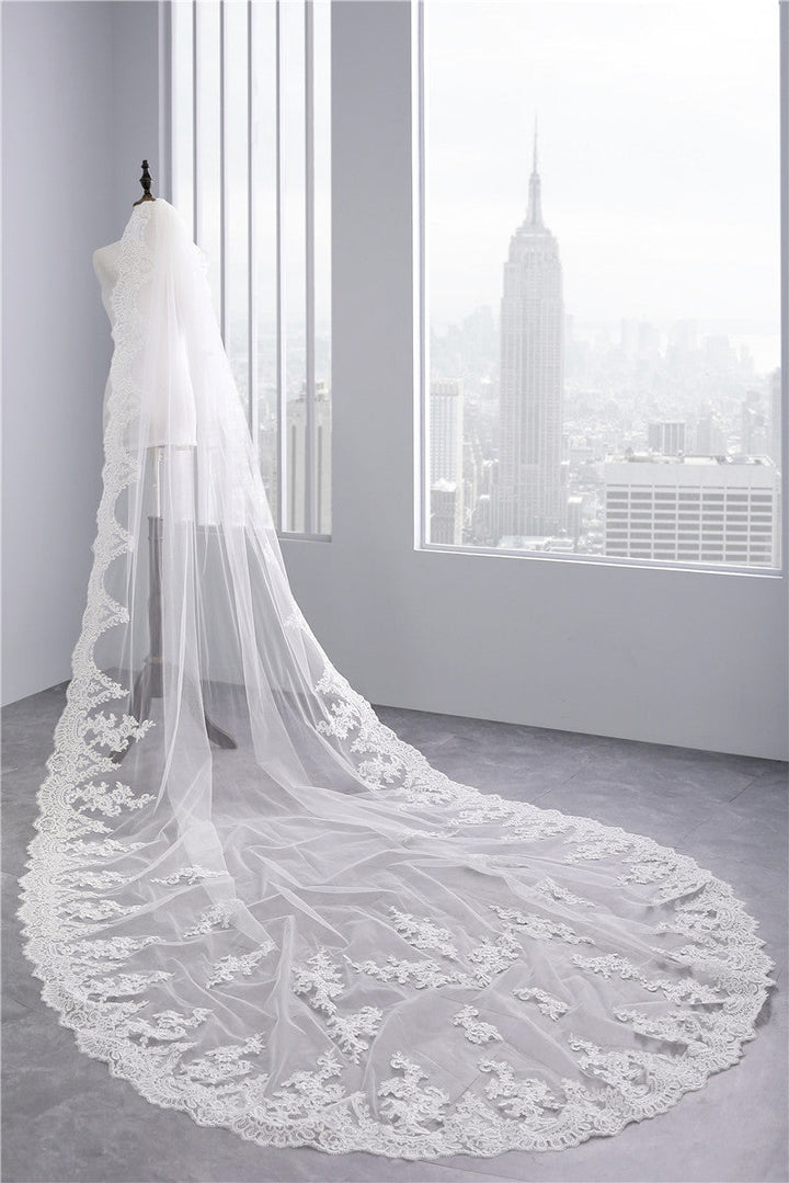 Voiles de Mariage D'Église Longs en Dentelle à Un Niveau avec Appliques