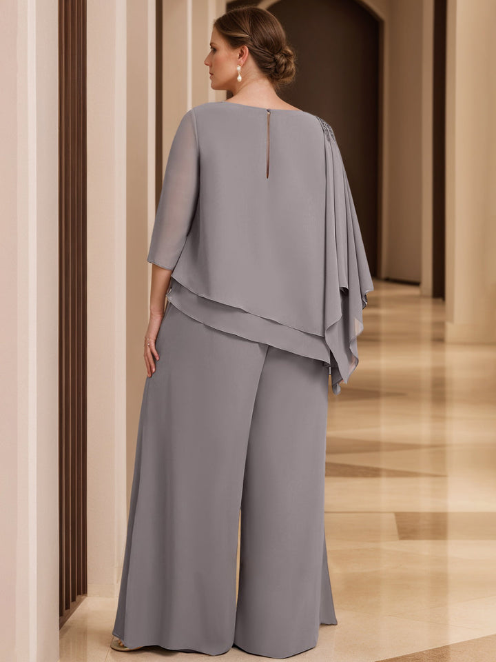 Robe de Mère de la Mariée Grande Taille en Mousseline de Soie 2 Pièces à Manches 3/4 et Longueur Au Sol avec Perles