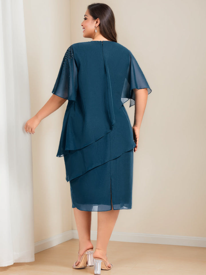 Robe Fourreau/Colonne à Manches Mi-Longues et Longueur Genou pour Mère de la Mariée, Grande Taille, avec Perles et Paillettes
