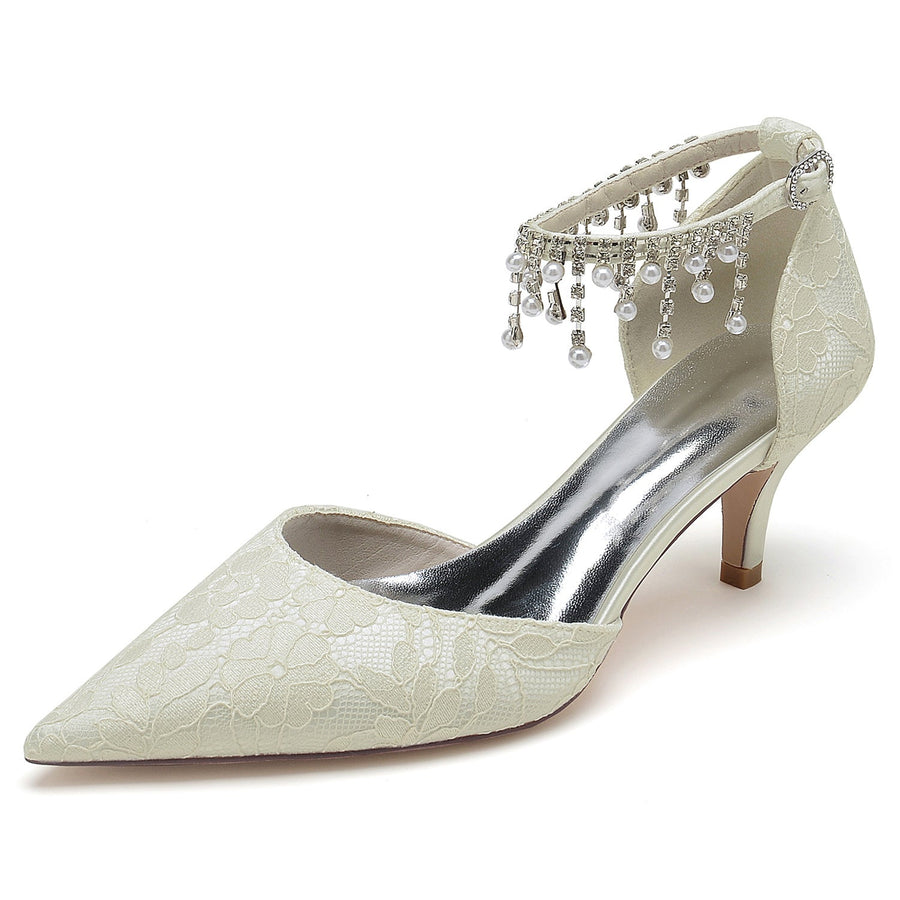 Chaussures de Mariage pour Femmes en Dentelle Perlée, Chaussures de Mariée à Bout Pointu et Bride à la Cheville