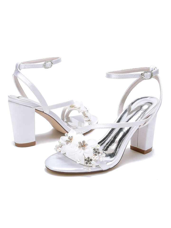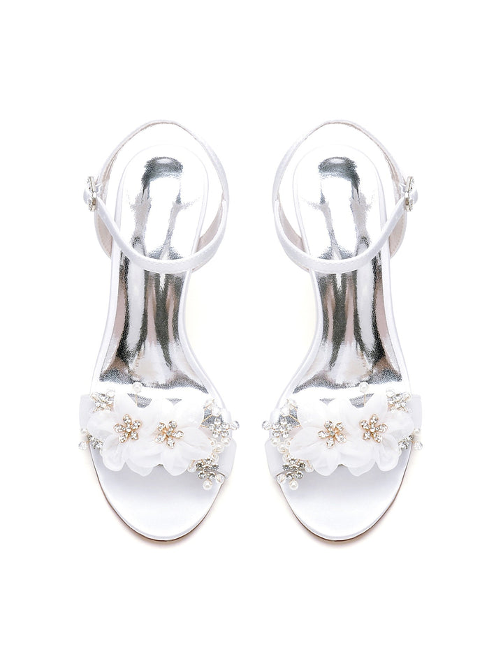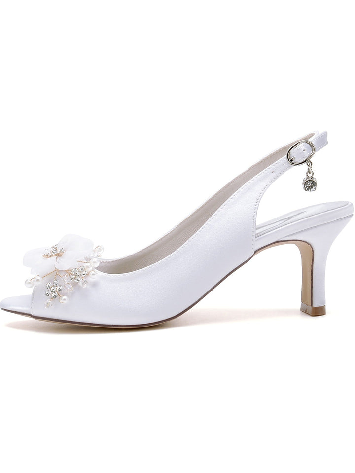 Chaussures de Mariage pour Femmes en Satin de Soie avec Fleur en Cristal et Boucle à Bout Ouvert