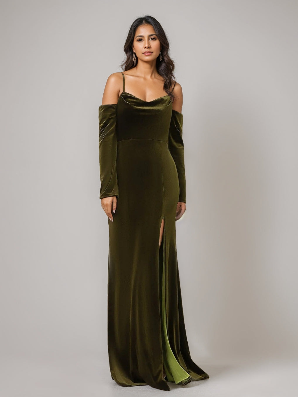 MON5412144 Ligne A/Princesse Bretelles Spaghetti Sans Manches La Longueur du Sol Velours Unique Robes de Demoiselle d'Honneur avec Côté Divisé