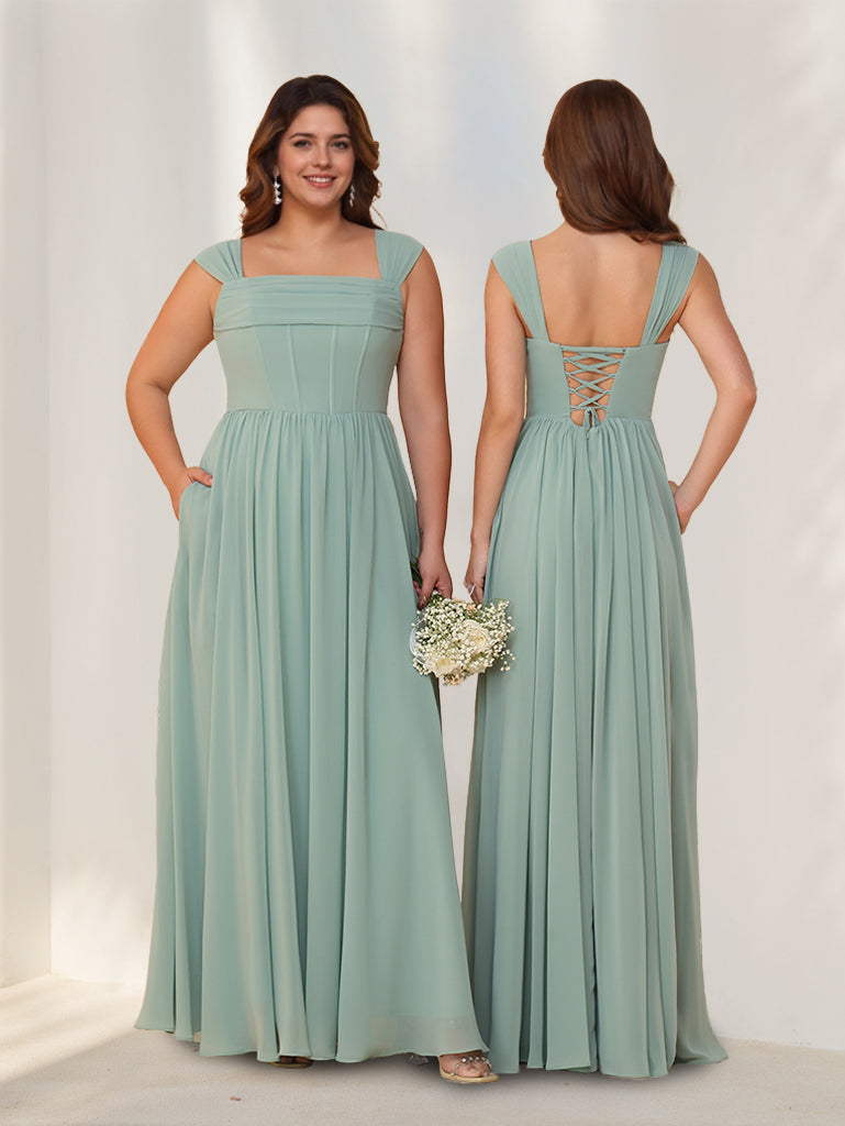 MON5412269 Ligne A/Princesse Carré Neck Sans Manches La Longueur du Sol Mousseline Robes de Demoiselle d'Honneur avec Plis