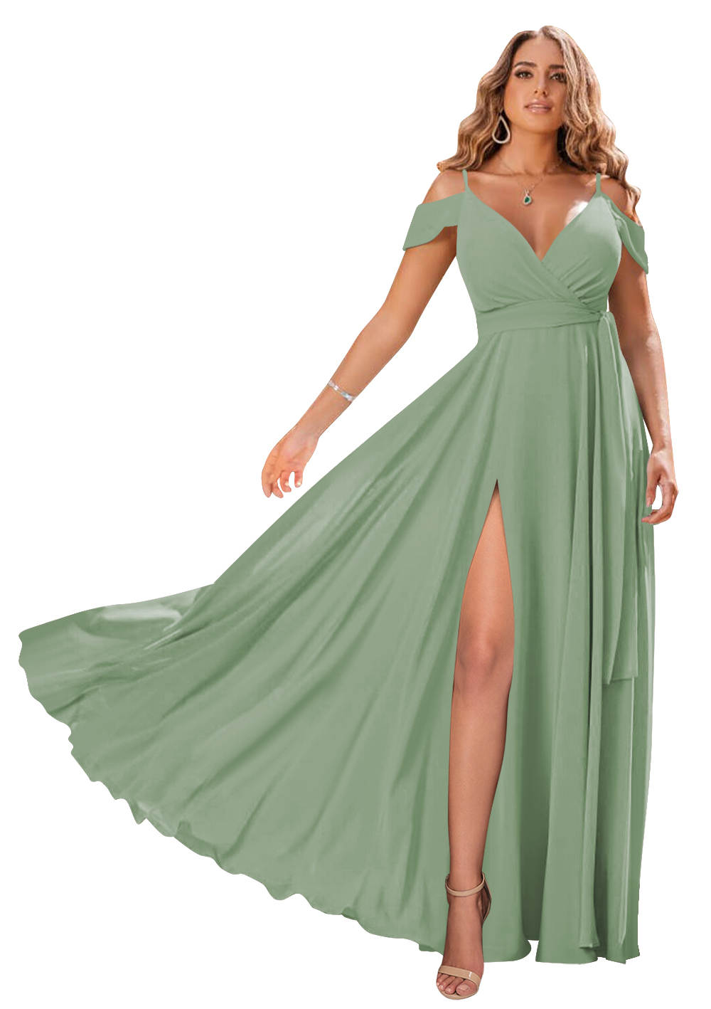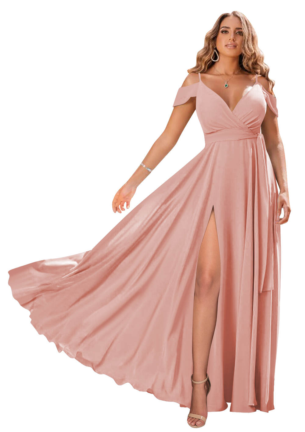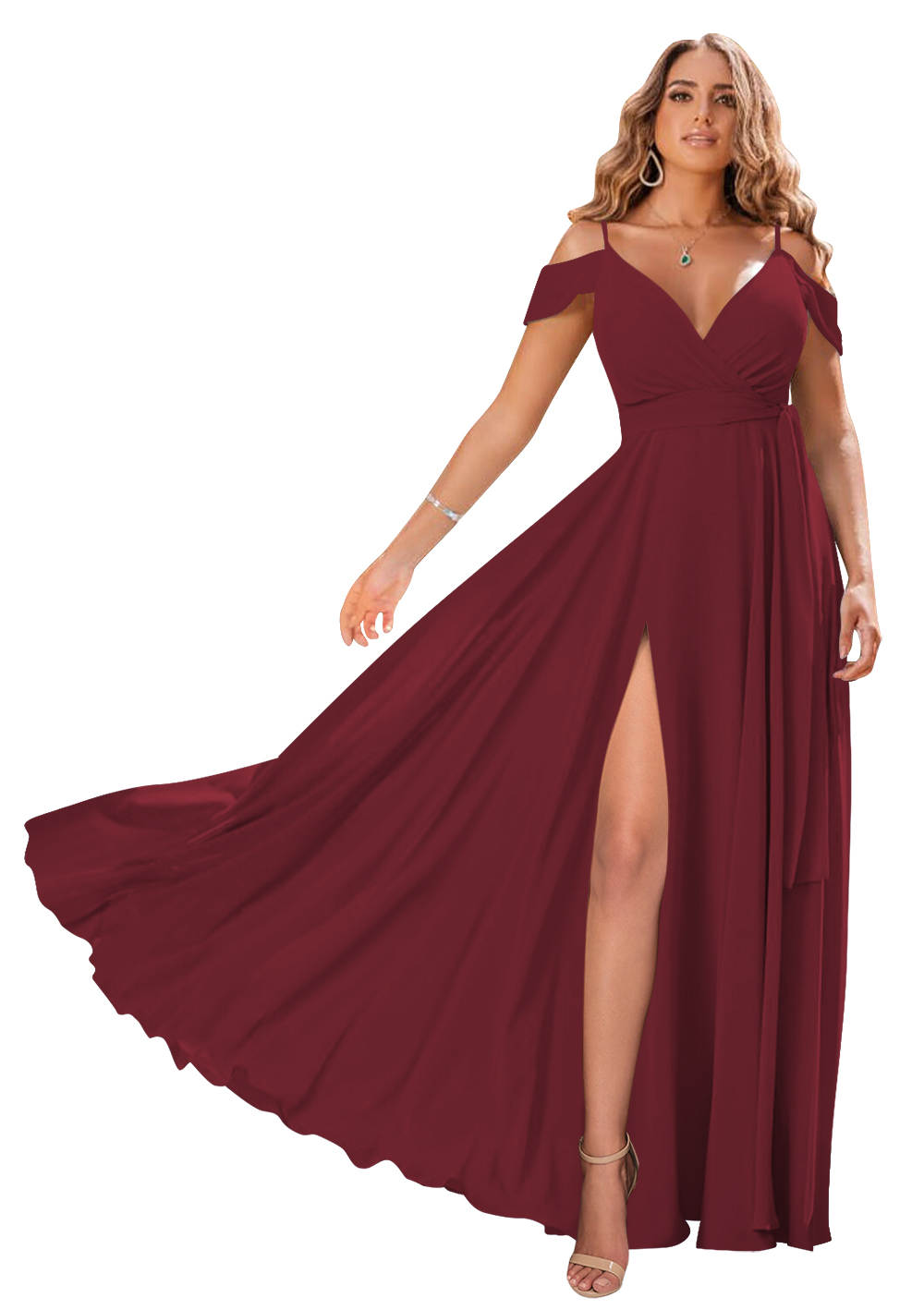 MONCY029 Robe de Demoiselle D'Honneur Longue à Épaules Dénudées et Coupe Princesse avec Fente Sur le Côté