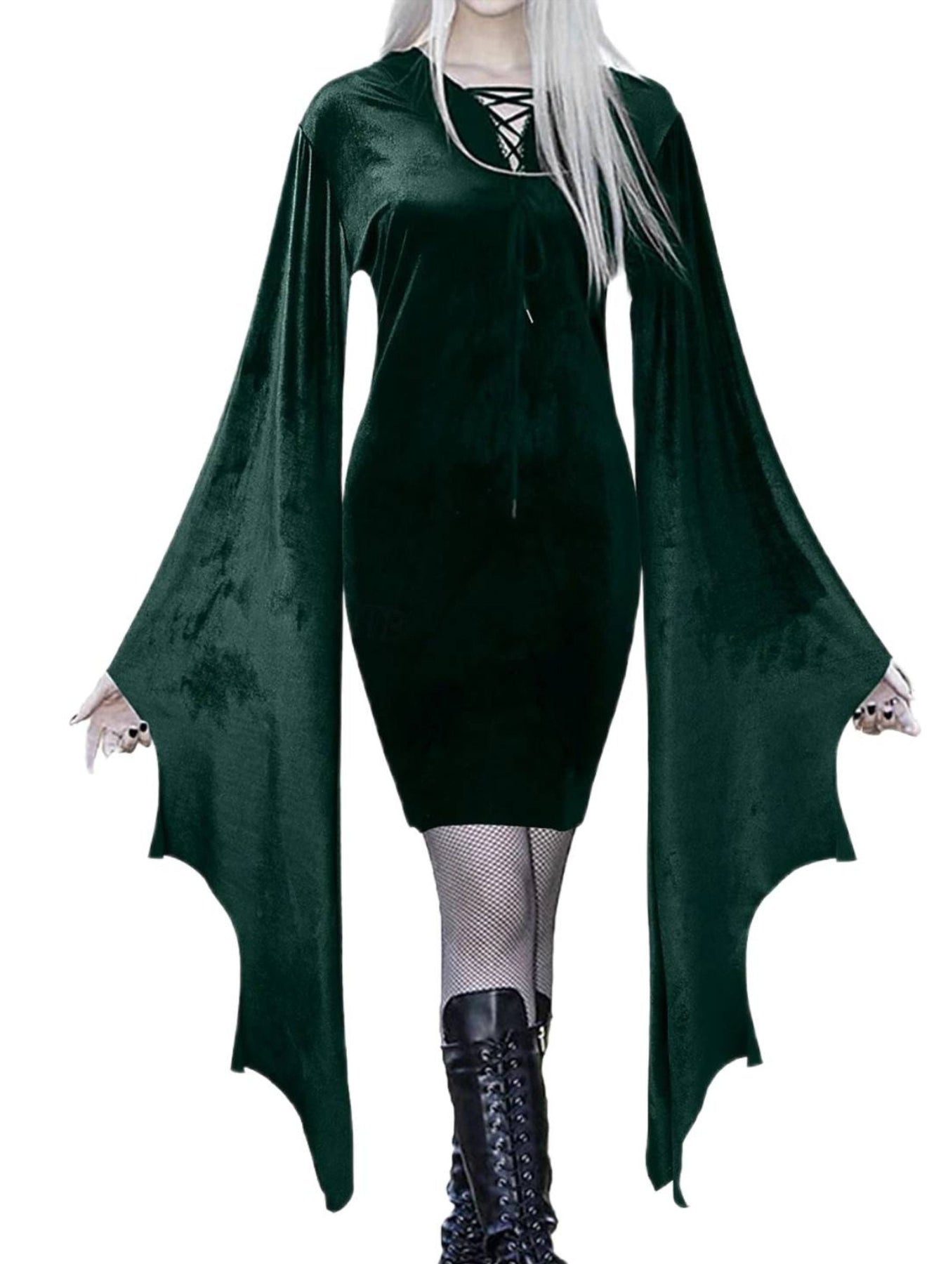 MON6041221 Robe Fourreau/Colonne Verte à Col en V et Manches Longues Chauve-Souris, Courte/Mini, pour Costume de Spectacle D'Halloween