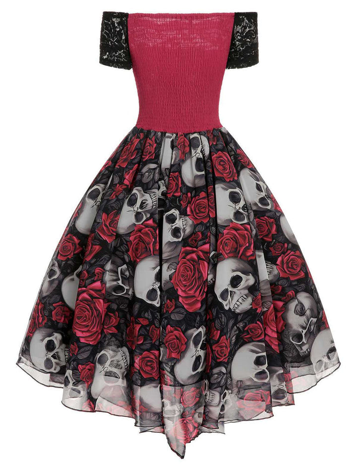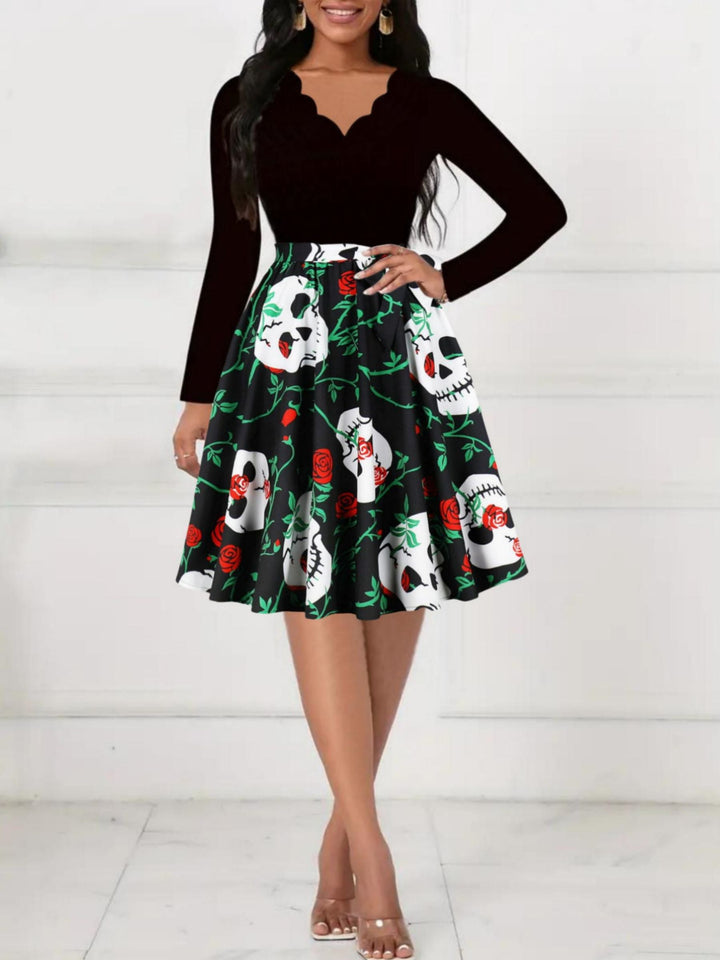 Robe Trapèze/Princesse à Col en V et Manches Longues, Longueur Genou, Imprimés, Costumes de Spectacle D'Halloween