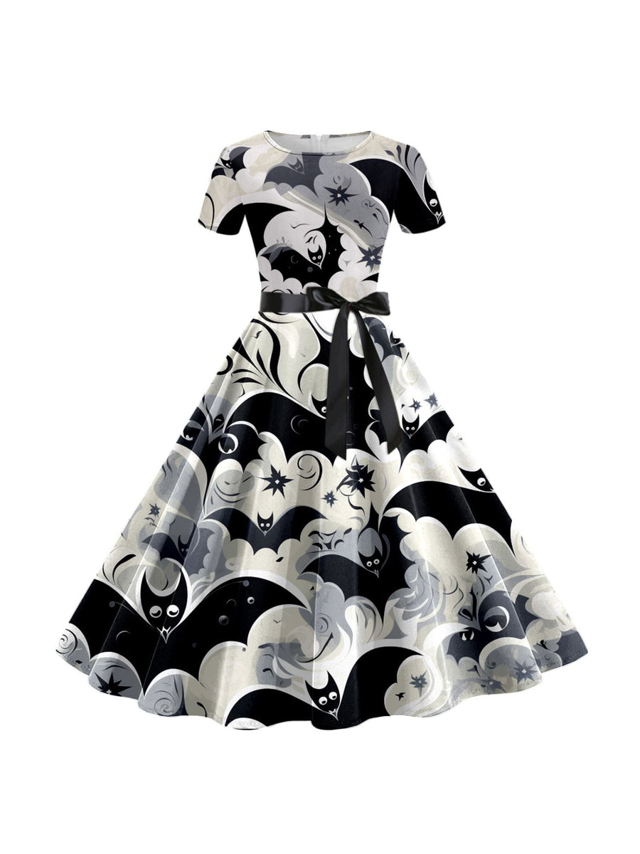 Robe de Costume de Spectacle Imprimée de Dessin Animé D'Halloween à Col Rond et Manches Courtes de Forme Trapèze/Princesse