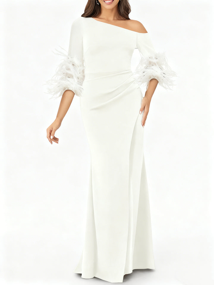 MON2312001 Robes de Mère de la Mariée en Forme de Trompette/Sirène avec Plumes et Une Épaule et Manches Longues en Mousseline