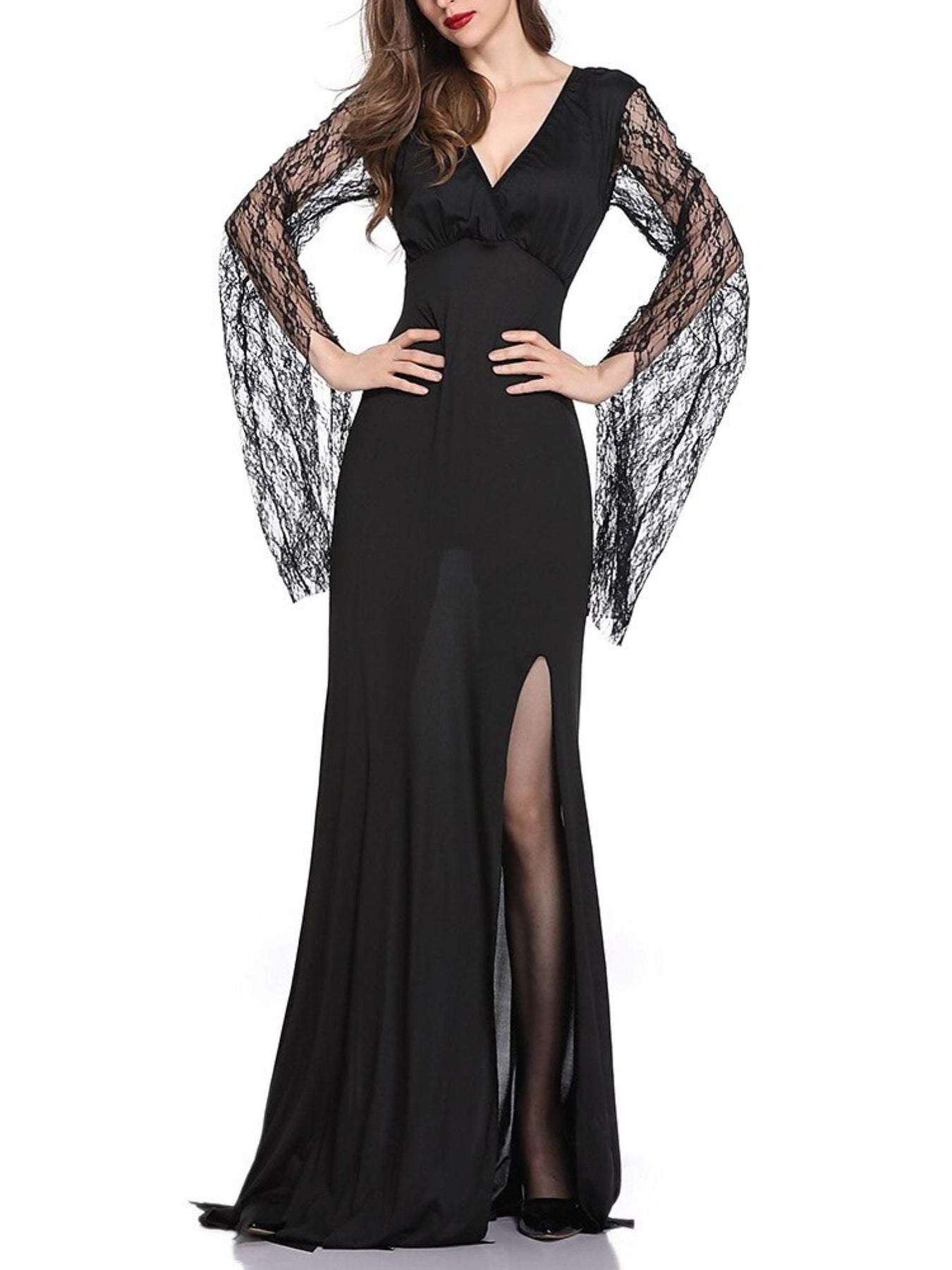 MON6041110W Robe de Costume D'Halloween Élégante Noire à Manches Longues et Col en V en Dentelle et à Col en V