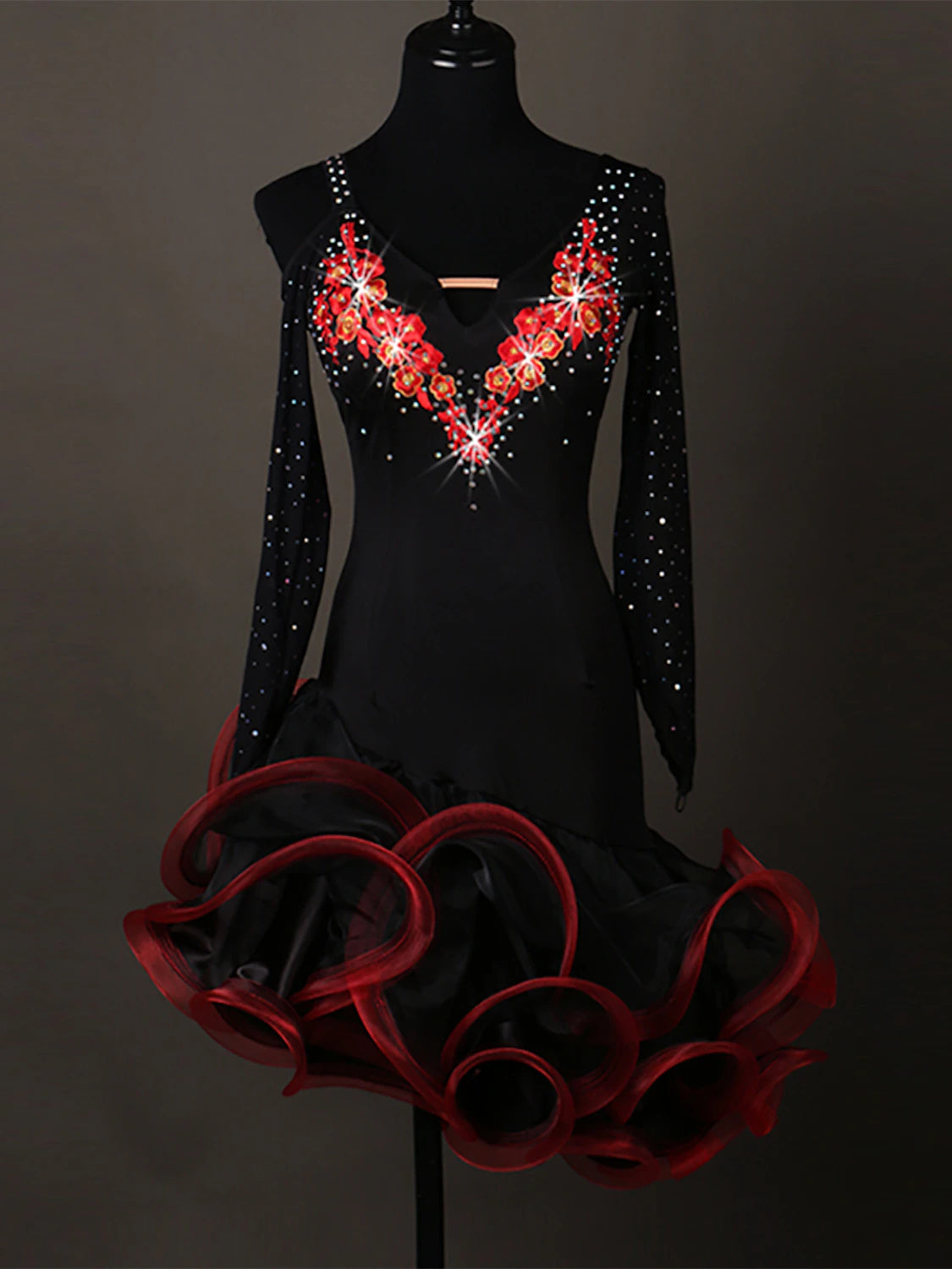 MON4041320W Robe de Danse Salsa Latine Cristaux/Strass Manches Longues Spandex Organza Femme鈥Ʀ® Entraînement Performance