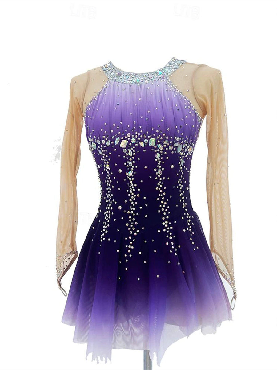 MON4041418W Robe de Patinage Artistique pour Femmes et Filles, Vêtements de Danse, Teinture Halo, Haute Élasticité, Cristal/Strass, Manches Longues, Robe de Patinage Sur Glace
