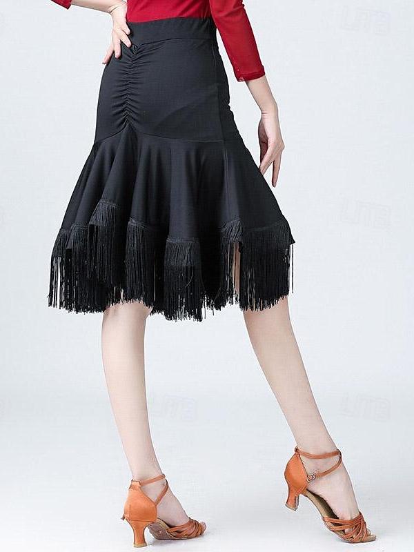 Jupes de Danse Latine à Pompons en Élasthanne à Haute Teneur en Couleur Pure pour Femmes