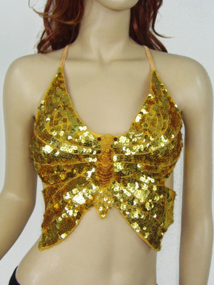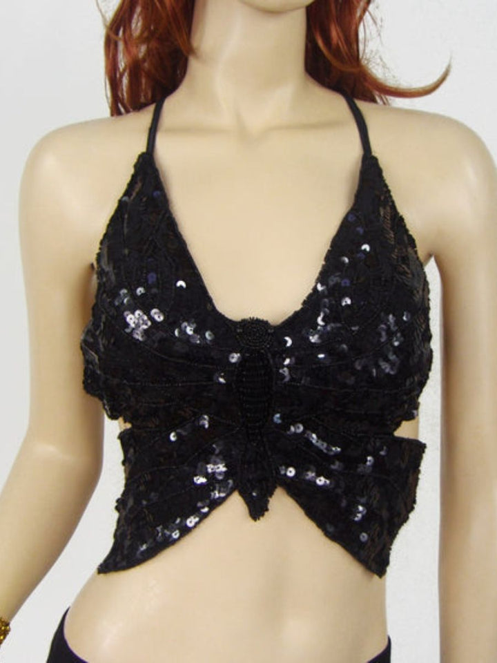 Danse Du Ventre Col en V Sans Manches Papillon Sexy Barre avec Perles et Paillettes