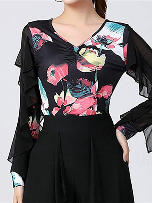 Vêtements de Danse pour Femmes Robe de Danse de Salon à Manches Longues Imprimé Floral Entraînement de Performance pour Femmes Polyester