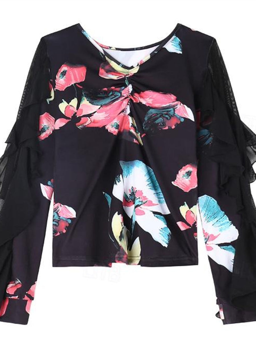 Danse Latine pour Femmes, Danse de Salon, Manches Longues, Polyester Haut, Tulle Épissé, Performance pour Femmes